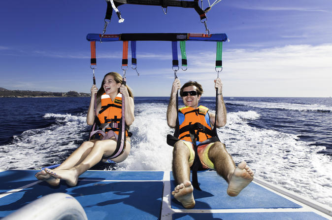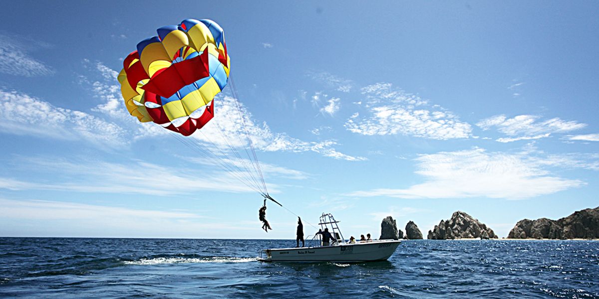 THE EXPERIENCED CREW WOULD GUIDE YOU THROUGH ALL THE PROCESS, FROM THE PLATFORM OF THE PARASAILING BOAT, SECURING THE HARNESSES TO TAKE YOU UP IN TO THE AIR TO ENJOY THE BEAUTIFUL VIEW OF THE PACIFIC OCEAN AND THE SEA OF CORTEZ WITH THE PANORAMIC VIEWS OF CABO SAN LUCAS, LAND’S END AND MEDANO BEACH.